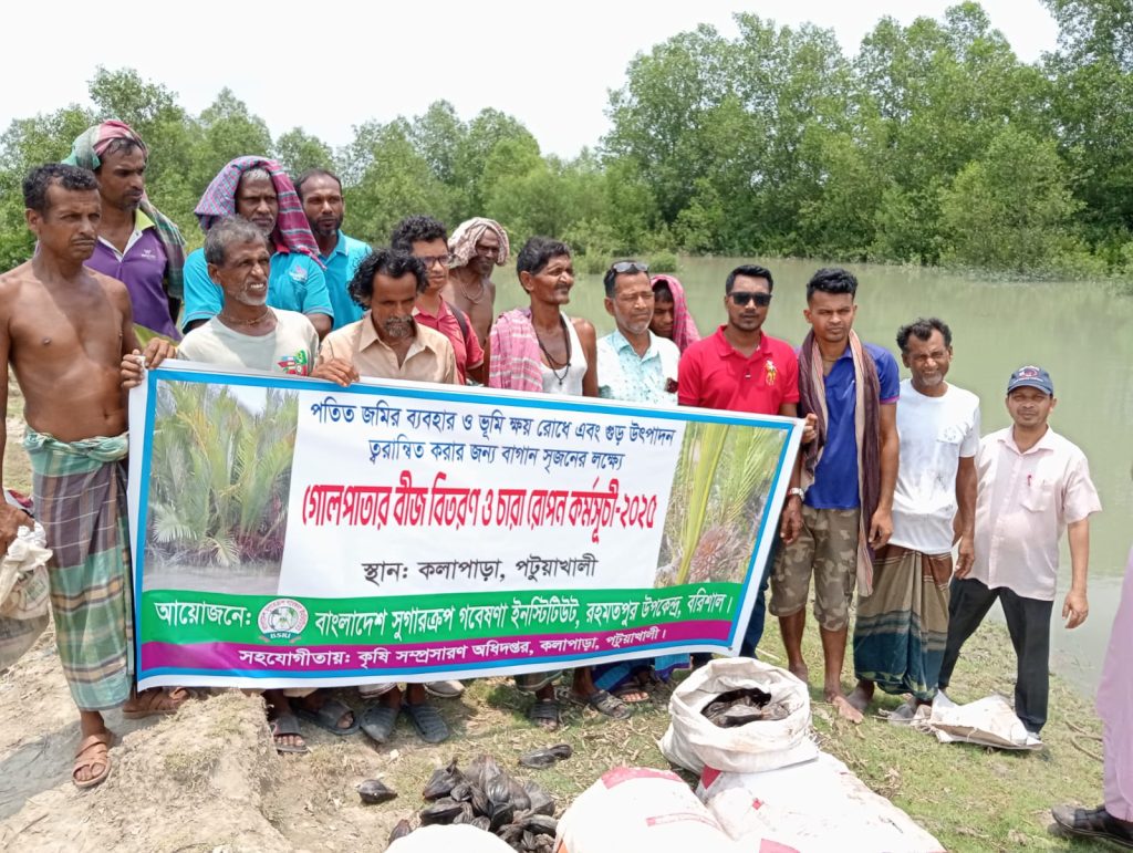 বাংলাদেশ সুগারক্রপ গবেষণা ইনস্টিটিউট, রহমতপুর উপকেন্দ্র বরিশাল আয়োজনে কলাপাড়া কষি সম্প্রসারণ অধিদপ্তর সহযোগীতায় পতিত জমির ব্যবহার ও ভূমি ক্ষয় রোধ করে গুড় উৎপাদন ত্বরান্বিত করার জন্য বাগান সৃজনের লক্ষ্যে গোলপাতার বীজ বিতরণ ও চারা রোপন কর্মসূচী-২০২৫ অনুষ্ঠিত হয়।