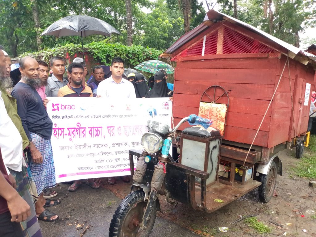 জলবায়ু পরিবর্তনের প্রভাব মোকাবিলা এবং প্রান্তিক জনগোষ্ঠীর বিকল্প আয়ের পথ সুগম করতে পটুয়াখালীর কুয়াকাটায় ১৩৬টি পরিবারের মাঝে হাঁস-মুরগির বাচ্চা, পালনের ঘর ও ম্যাট বিতরণ করা হয়েছে।