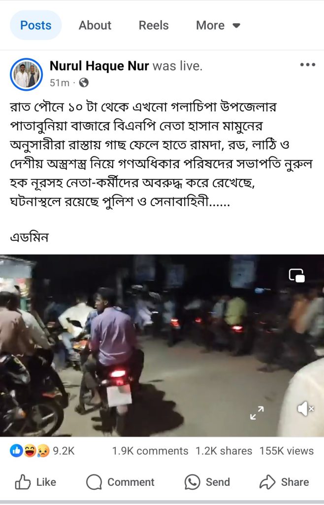 গন অধিকার পরিষদ সভাপতি ও ডাকসুর সাবেক ভিপি নূরুল হক নূরকে তার নিজ নিবাচনি এলাকা পটুয়াখালীর গলাচিপায় পথরোধ করে রেখেছে বলে দাবী করেছেন তিনি। নূরের ভেরিফাইড ফেজবুকে রাত এগারোটার দিকে দেয়া একটি স্ট্যাটাসে তিনি দাবী করেন গলাচিপা উপজেলার পাতাবুনিয়া বটতলা বাজারে বিএনপি নেতা হাসান মামুনের অনুসারীরা রাস্তায় গাছ ফেলে গুলতি,রড,রামদা নিয়ে আমাদের পথ রোধ করেছে। স্থানীয় কয়েকজনকে মারধর করে দুটি মোটর সাইকেলও ভাংচুর করেছে।