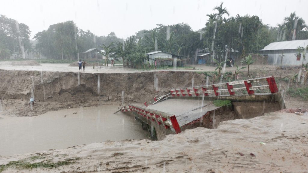 পানির তোরে ধসে যায় ময়মনসিংহের মুক্তাগাছায় আয়মন নদীর ওপর নির্মিত বক্স কালভার্ট। এতে উপজেলা সদরের সঙ্গে যোগাযোগ বিচ্ছিন্ন হয়ে গেছে দুই ইউনিয়নের অন্তত ৩০ হাজার মানুষের।