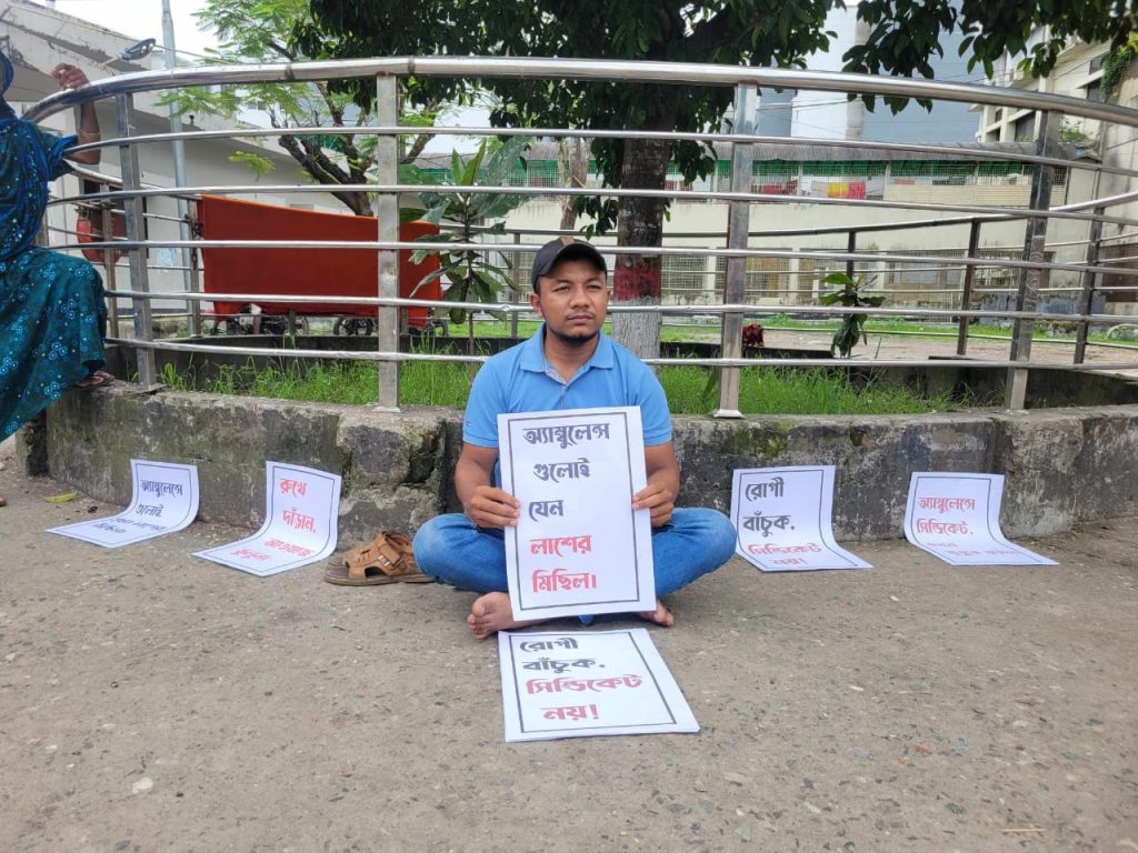 পটুয়াখালীতে এ্যাম্বুলেন্স সিন্ডিকেট নিয়ে সরাসরি সংবাদ প্রচারের সময় মো. রায়হান নামের এক সাংবাদিককে এ্যাম্বুলেন্সের ধাক্কার প্রতিবাদে প্রতীকী অনসনে বসেছেন তিনি।