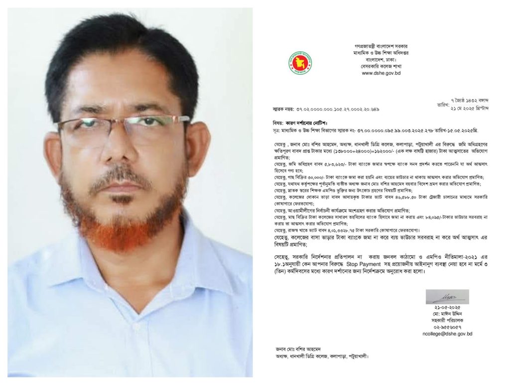 ধানখালী ডিগ্রি কলেজের অধ্যক্ষ বশির আহমেদ এর বিরুদ্ধে ঘুষ, দুর্নীতি ও টাকা আত্মসাৎ এর অভিযোগ।
